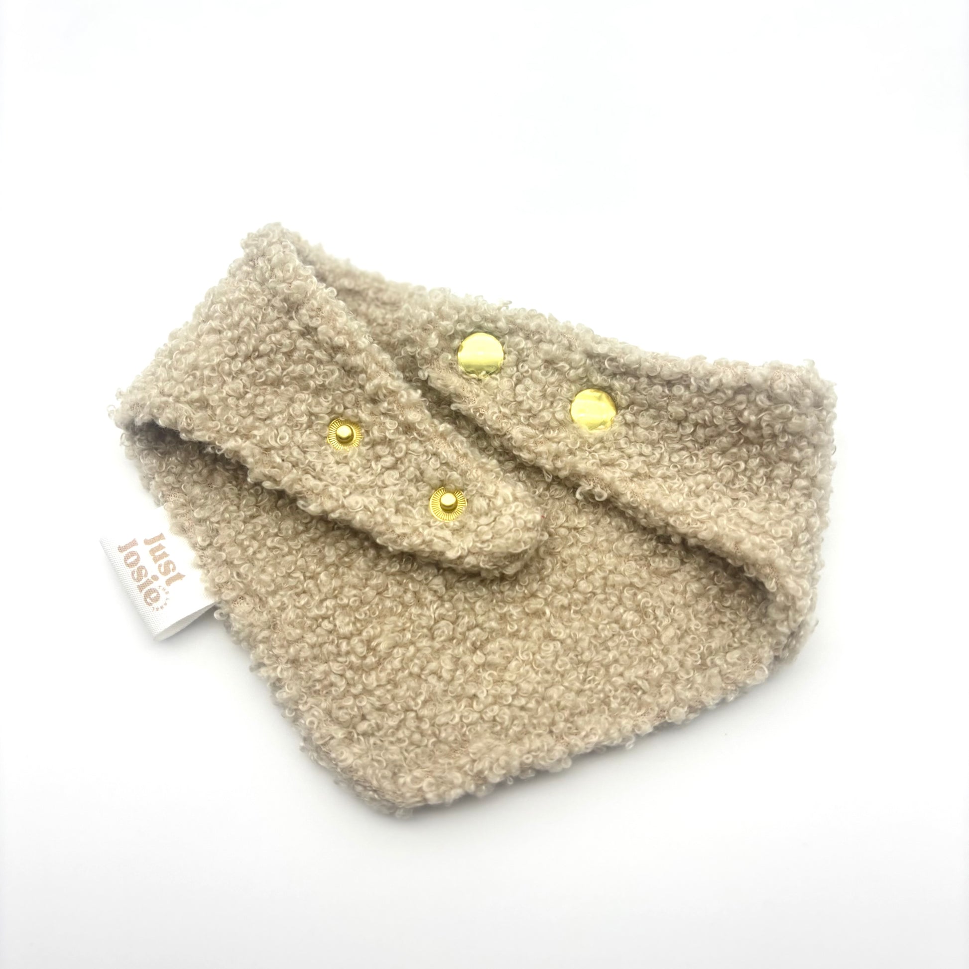 Die Halstücher aus Bouclé Soff sind sehr kuschelig und werden mit goldenen Druckknöpfen geschlossen. Für den Verschluss nutzen wir ausschließlich hochwertige Knöpfe, die den Vorteil bieten die Größe etwas zu verstellen.